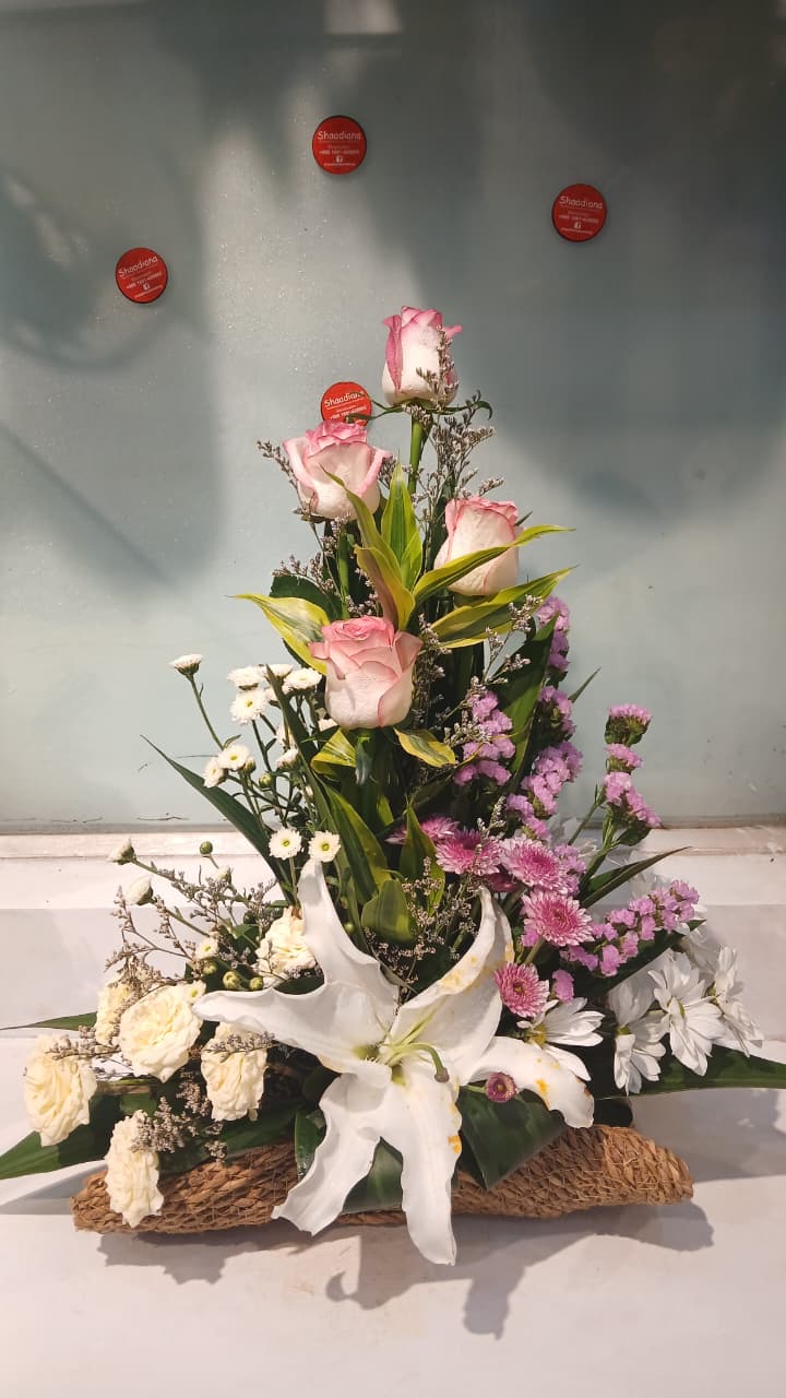 A beautiful floral arrangement makeing Chinese Yellow Pink Lily, Chinese Krishanthi Mum, Gypsy, White Orchid, White Gerbera, and Designing Green Leaves. To order inbox us on WhatsApp Shaadiana Floral Shop… -
