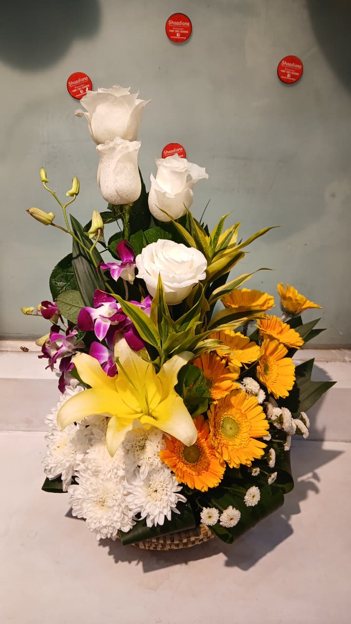 A beautiful floral arrangement makeing Chinese Yellow Lily, White Orchid, Limu, Carnation and Designing Green Leaves with Chinese Bag. Â To order inbox us on WhatsApp Shaadiana Floral Shop & Event… -