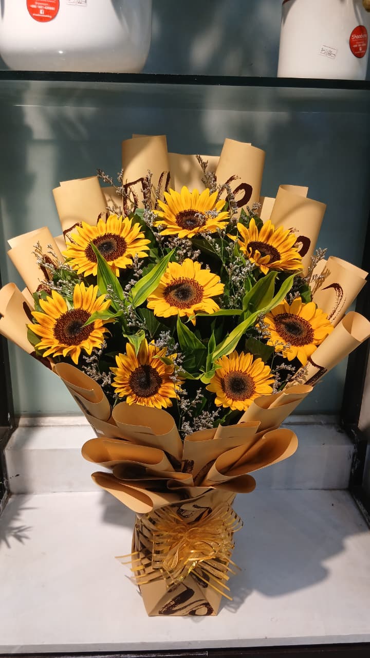 A beautiful floral arrangement makeing Chinese Blue Rose, White Gypsy, Pink Lily, Purple Orchid and Designing Green Leaves.