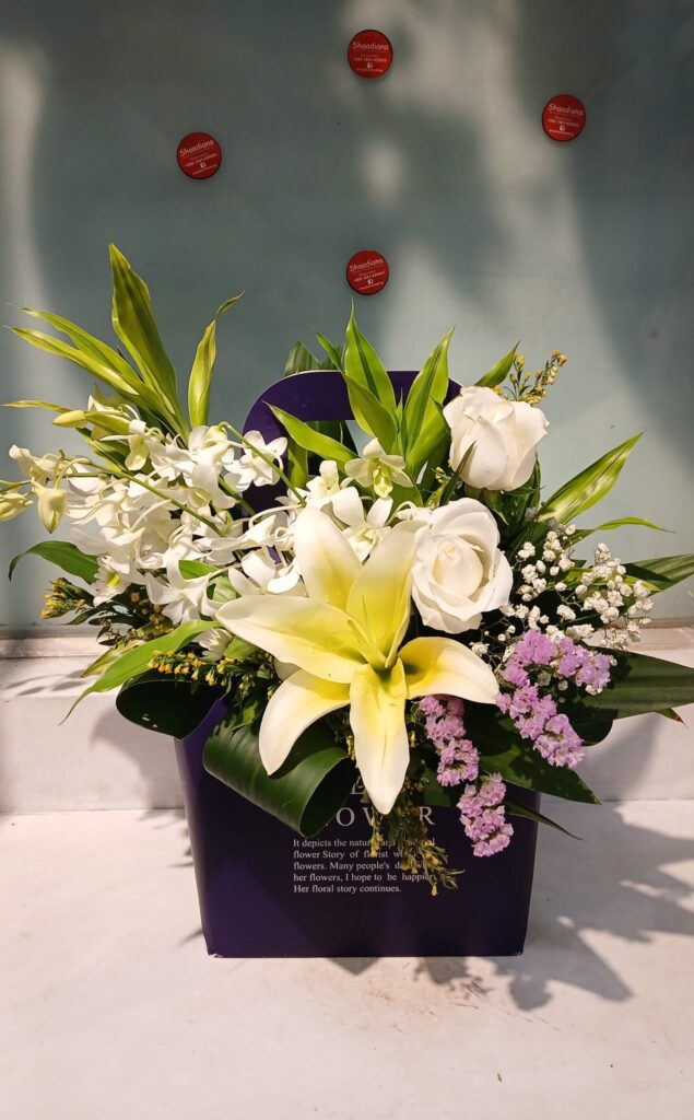 A beautiful floral arrangement makeing Chinese Yellow Lily, White Orcids, Chinese Rose, statice, Chinese Gypsy and Designing Green Leaves With a bag .