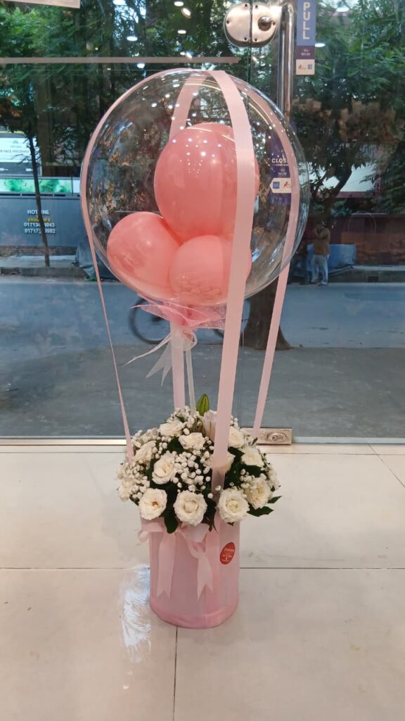 A beautiful floral makeing arrangement Balloon, Chinese White Lily, Indian White Rose, Chinese Limu, White Gypsy, Designing Green Leaves and Flower Box.