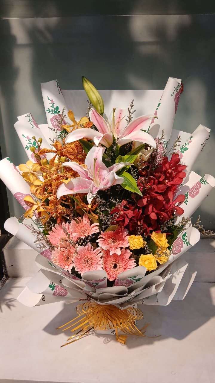 The arrangement features a mix of vibrant Rainbow Flower Rose, Red Roses, White Roses, Pink Lily Flowers, Carnation,Krishanthi Mum And Green Orchid.