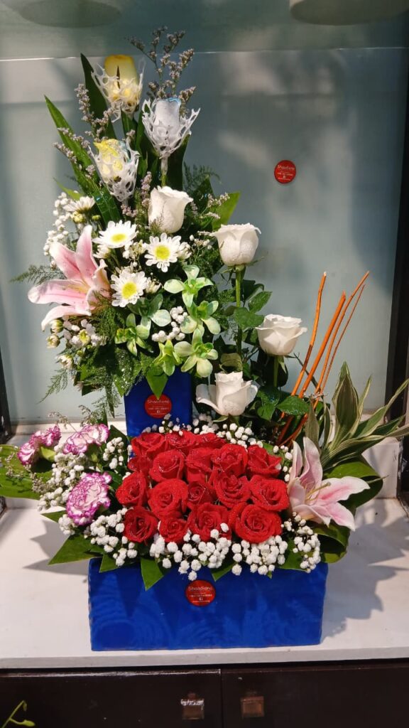 A beautiful floral arrangement in a tiered, blue, decorative box. The arrangement features a mix of vibrant Rainbow Flower Rose, Red Roses, White Roses, Pink Lily Flowers, Carnation,Krishanthi Mum And Green Orchid.