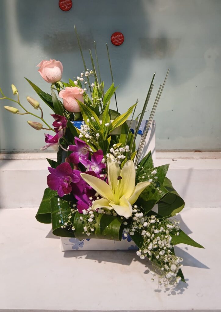 A beautiful floral arrangement makeing Chinese Yellow Lily, Chinese Rose, Gypsy, Purple Orchid, Lucky Bamboo and Designing Green Leaves.
