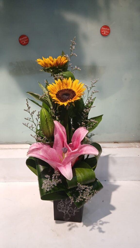 A beautiful floral arrangement makeing Chinese Pink Lily, Indian Sunflower, Limu, Lucky Bamboo and Designing Green Leaves.