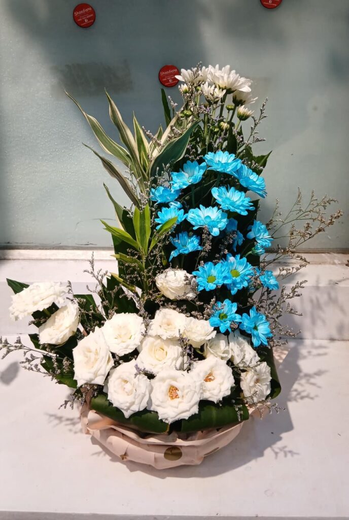 A beautiful floral arrangement makeing Chinese White and Blue Krishanthi Mum, Indian White Rose, Chinese Lucky Bamboo, Chinese Limu And Designing Green Leaves With a Paper.