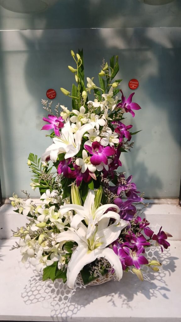 A beautiful floral arrangement makeing Chinese White Lily, Limu, Purple and White Orchid, Lucky Bamboo and Designing Green Leaves.