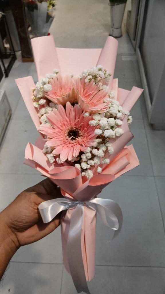 A beautiful floral arrangement makeing Pink Gerbera, Chinese White Gypsy and Pink Paper.