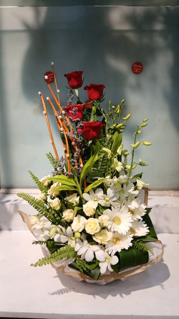 A large bouquet of flowers arrangement Chinese Red rose, White rose, White orchids,Limu, Green leaves.