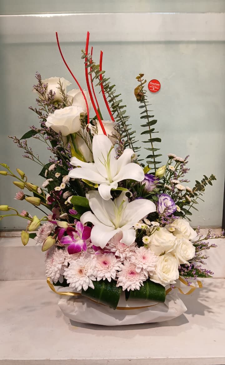 A beautiful floral arrangement makeing Chinese White Rose, Limu with Gypsy, Krishanthi Mum, Lucky Bamboo and Designing Green Leaves. To order inbox us on WhatsApp Shaadiana Floral Shop & Event… -
